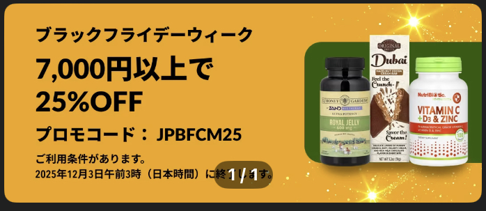 アイハーブのブラックフライデーの割引率ですが、セール内容は、購入金額7,000円以上で25%オフとなっています。
